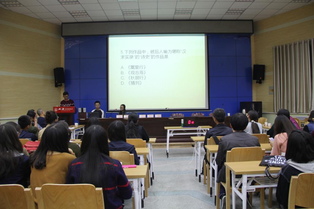 比赛设“梦回盛唐选择题”“横槊赋诗对答题”和“激流勇进抢答题”3个环节,每个环节,同学们都以饱满的热情投入到比赛中,大家你追我赶,互不相让。比赛期间,评委老师对同学们的疑问进行了详细的解答。