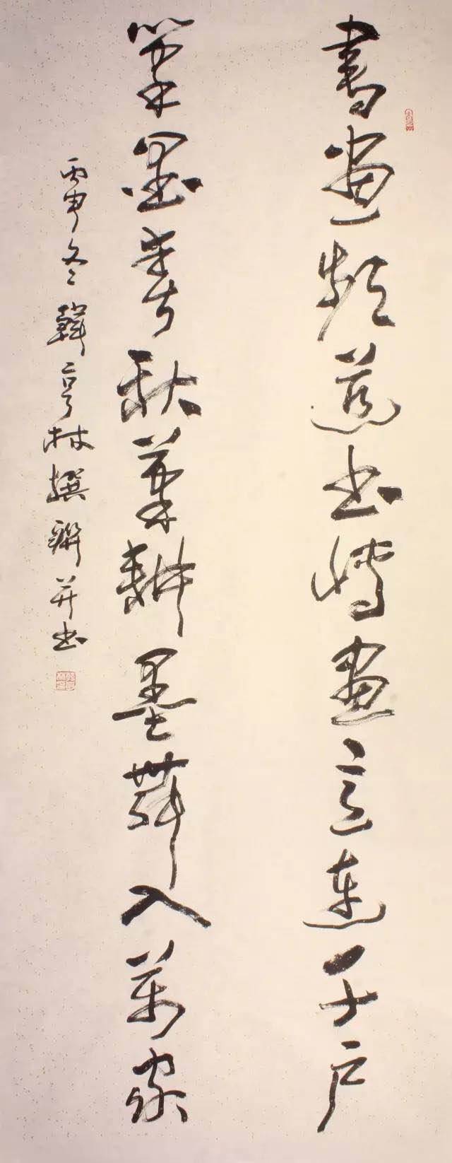 此联草书笔力恣肆浑厚、墨色苍润滞涩、线条生辣刚猛,有唐人怀素草书之意趣。联句通过巧妙的对仗,描写对新春的期盼。