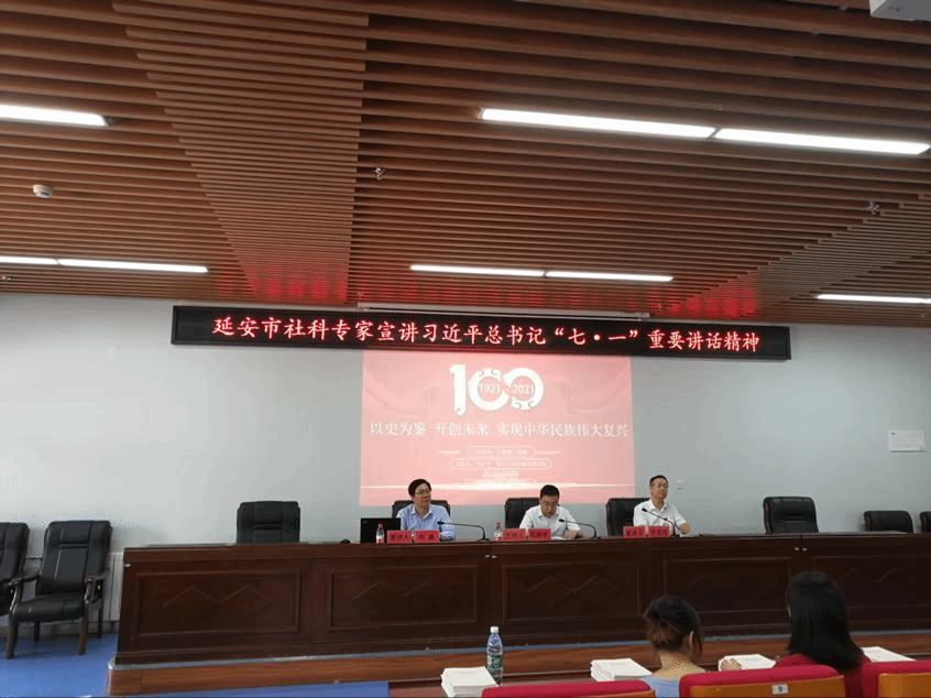 马彦平在主持宣讲活动时表示,延安市社科联隆重庆祝中国共产党成立100周年,高度重视习近平总书记“七·一”重要讲话精神的学习和宣讲活动,为此,决定延长延安市社会科学专项资金2021年度规划项目课题申报时限,将申报截止时间从5月7日延长到8月1日。希望广大社科工作者认真学习、贯彻落实习近平总书记在庆祝中国共产党成立100周年大会上的重要讲话精神,以讲话精神统揽社科工作全局,积极研究阐释讲话的重大意义、丰富内涵、核心要义、实践要求,调整、提升课题,以推动社科工作更好更快地发展。同时,马书记表示,延安市社科联号召本市社科专家、学者认真学习并深刻领会习近平总书记“七·一”重要讲话精神,并结合工作实际开展好宣讲活动。