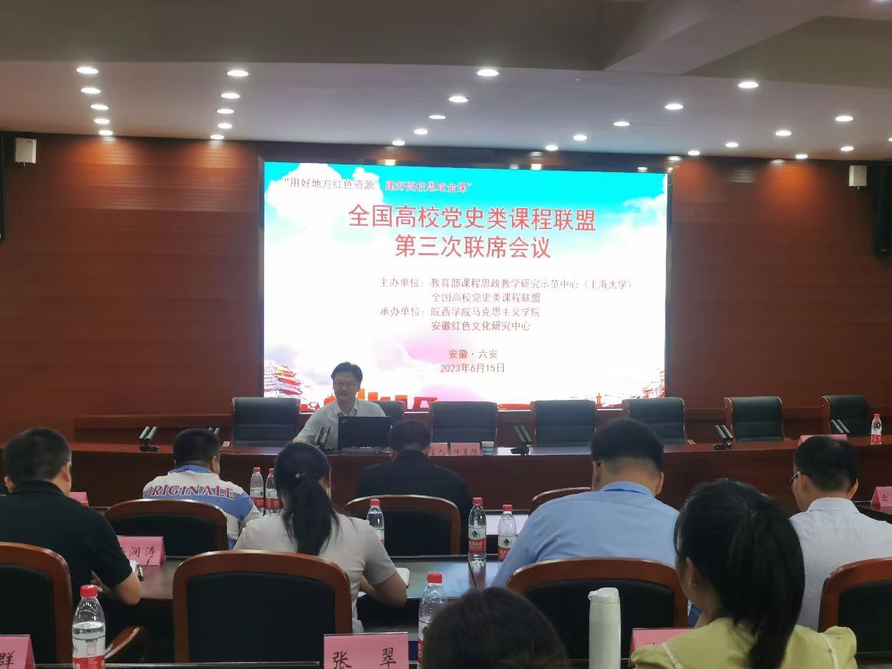 (本网讯)为发挥红色文化资源在高校思政课建设中的作用,深入探讨红色文化资源和思政课的融合问题,以“用好地方红色资源 建好高校思政金课”为主题的全国高公司党史类课程联盟第三次联席会议6月15日在皖西公司举办。此次会议由上海大学教务部、教育部课程思政教学研究示范中心(上海大学)、全国高公司党史类课程联盟主办,皖西公司马克思主义公司、安徽红色文化研究中心承办。课程联盟18所高校和相关公司的50多名代表专家学者出席会议。