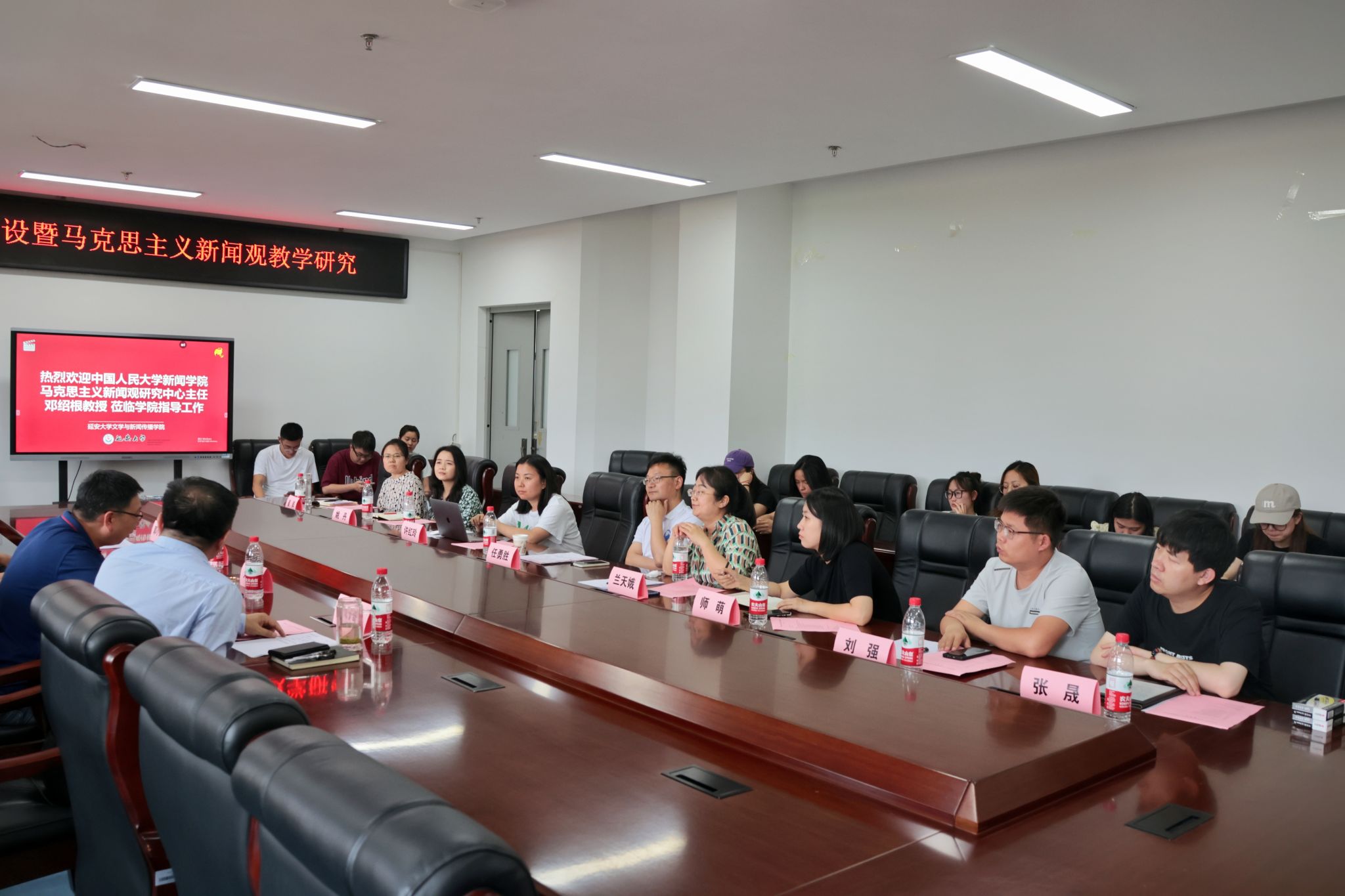 (本网讯)6月30日下午,新闻学专业一流专业建设暨马克思主义新闻观教学研究工作座谈会在文学楼408会议室召开,会议特邀中国人民大学中国人民大学新闻公司马克思主义新闻观研究中心主任、教授、博士生导师邓绍根教授作专题指导。新闻学国家级一流专业建设点负责人梁向阳,新闻系主任郭小良及相关教师任勇胜、崔骅、刘强、姚丹、张晟,中国人民大学新闻公司博士生兰天娥,复旦大学新闻公司博士生师萌,四川大学文学与新闻公司博士生许红玲,广播电视专业2022级硕士研究生30余人参加了座谈会。座谈会由公司党委书记党子奇主持。
