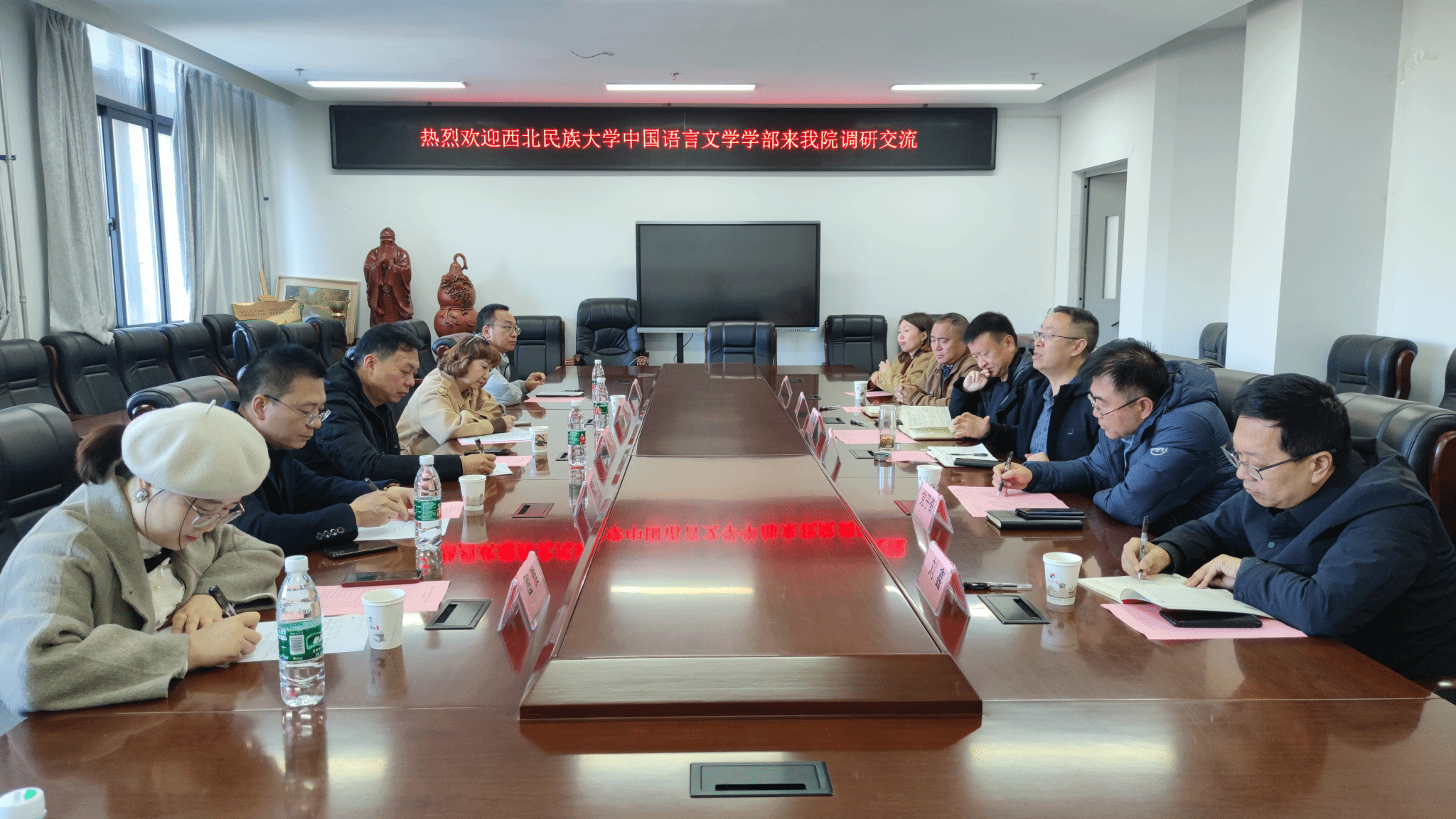会议交流期间,公司党委书记党子奇就党建工作与课程思政、党委副书记张冰雁就员工工作与人才培养、副经理杨绍固与教学秘书张亚玲就本科公司产品审核评估、副经理刘鑫就研究生与科研工作与西北民族大学中国语言文学学部副主任韩晓清、汉语言系主任凯丽比努、中国少数民族语言文学系副主任夏吾拉旦、应用语言学系副主任图雅进行深入探讨交流。