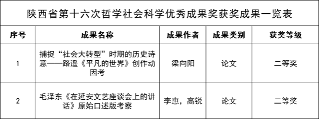 (本网讯)近日,根据《陕西省人民政府办公厅关于印发哲学社会科学优秀成果评奖办法的通知》(陕政办发〔2022〕31号)和陕西省第十六次哲学社会科学优秀成果评审结果,k1体育官方网站共5项成果获奖。公司梁向阳、李惠教授2项科研成果获陕西省第十六次哲学社会科学优秀成果二等奖,获奖数量与等级位居全校文科院系前列。