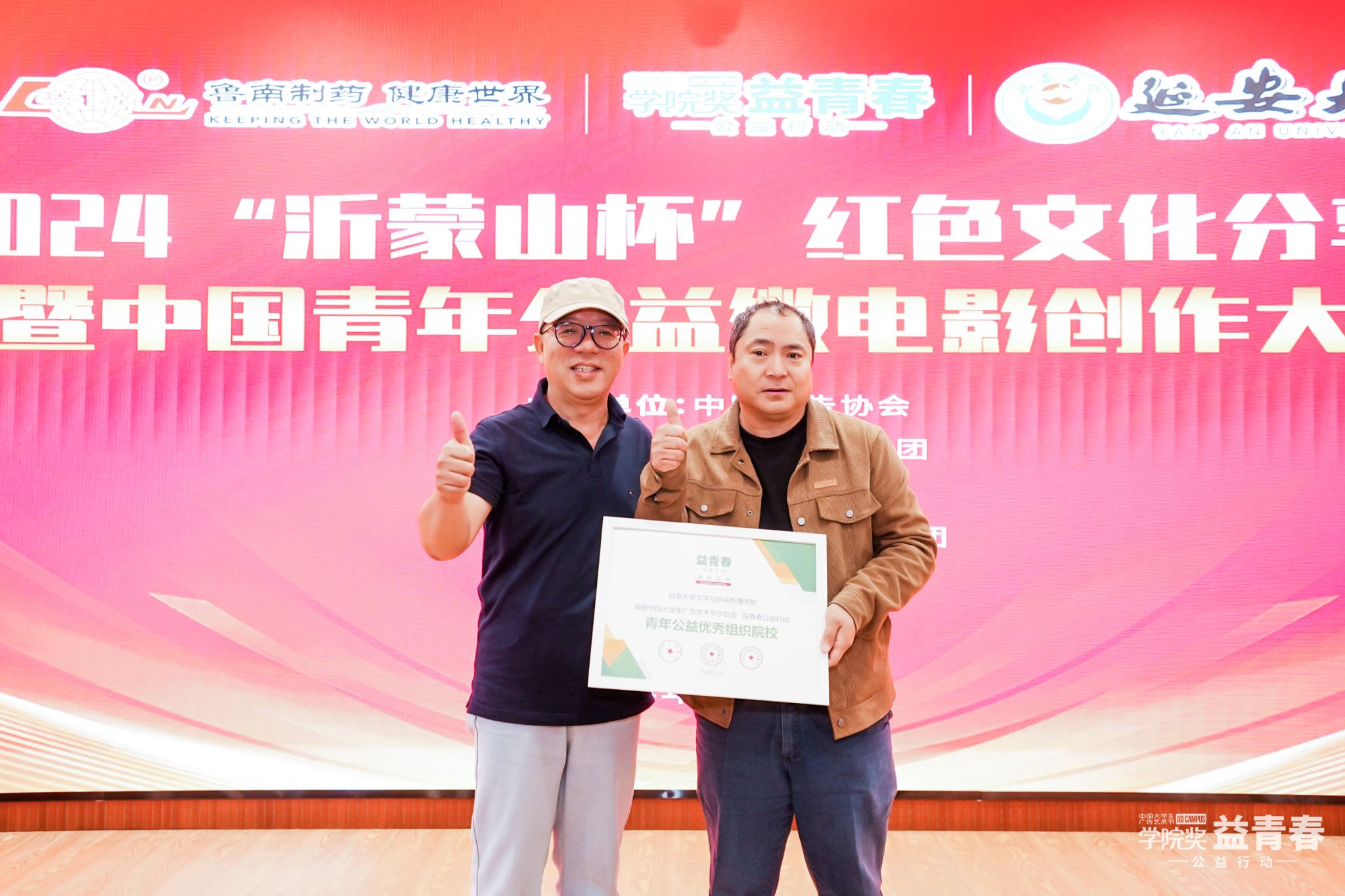 紧接着,广告人文化集团副总裁张汛先生在致辞中讲:“我们携手鲁南制药集团、沂蒙精神宣讲团走进k1体育官方网站,希望搭载中国老员工广告艺术节公司奖·益青春公益行动,‘沂蒙山杯’中国青年公益微电影创作大赛,号召全国高校学子加入赛事中来,通过创意创作的形式,让更多的人了解沂蒙精神,挖掘当代老员工的责任与担当,激发广大青年员工的爱国热情,树立正确新三观,引导年轻人积极投身公益事业,传承红色基因,为实现中华民族伟大复兴的中国梦贡献青春力量。”之后,组委会为公司颁发“中国老员工广告艺术节公司奖·益青春公益行动·青年公益优秀组织院校”证书,公司副经理杨绍固代表公司领奖。