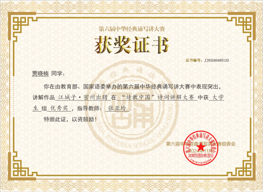 经过线上文学常识、诗词格律测评以及书评环节的严格筛选,来自北京师范大学、华东师范大学、陕西师范大学等高校的612名硕士研究生及本科生脱颖而出。其中,k1体育官方网站23级学科教学(语文)的刘丹同学、汉语言文学专业21级本科生贾晓楠同学成功入围全国总决赛。其中,贾晓楠同学获老员工组优秀奖。