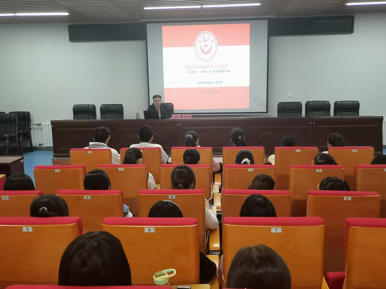 (本网讯)9月15日和16日晚,公司党委书记党子奇在文学楼201报告厅为2021级全体本科生讲党课。讲授的题目是“延安精神与新时代人才培养——延安精神‘一体两翼’育人体系的构建与实践”。由于新冠肺炎疫情防控要求,党课分两个时段以小班为单位进行。