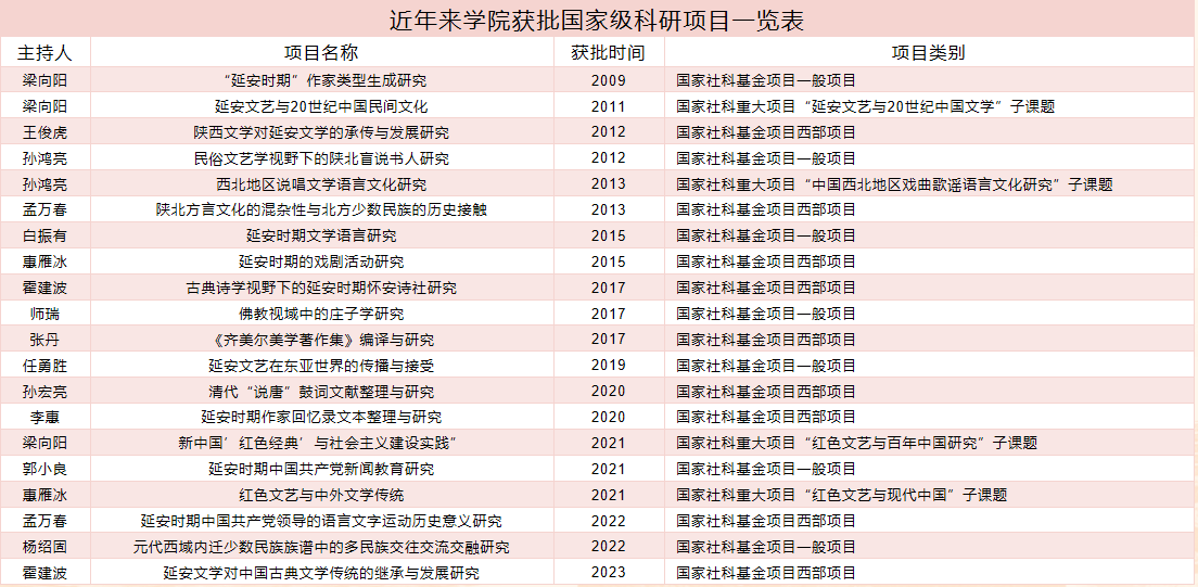 中国现当代文学硕士点是公司最早设立的二级学科,形成了延安文艺研究、中国现代著名作家研究、陕北地域文化与知青文学研究的学术特色,在延安文艺研究方面体现出明显的优势。拥有“路遥与知青文学研究中心(省级哲学社会科学重点研究基地)”、“延安文艺研究中心”、“红色文艺研究中心”三个国内有影响、省内知名的学术研究基地,以及面向教学科研与社会服务的“路遥文学馆”。本硕士点以延安文艺研究、路遥研究为双核的学科特色,形成现代文学与当代文学两个研究方向,均收全日制硕士生。