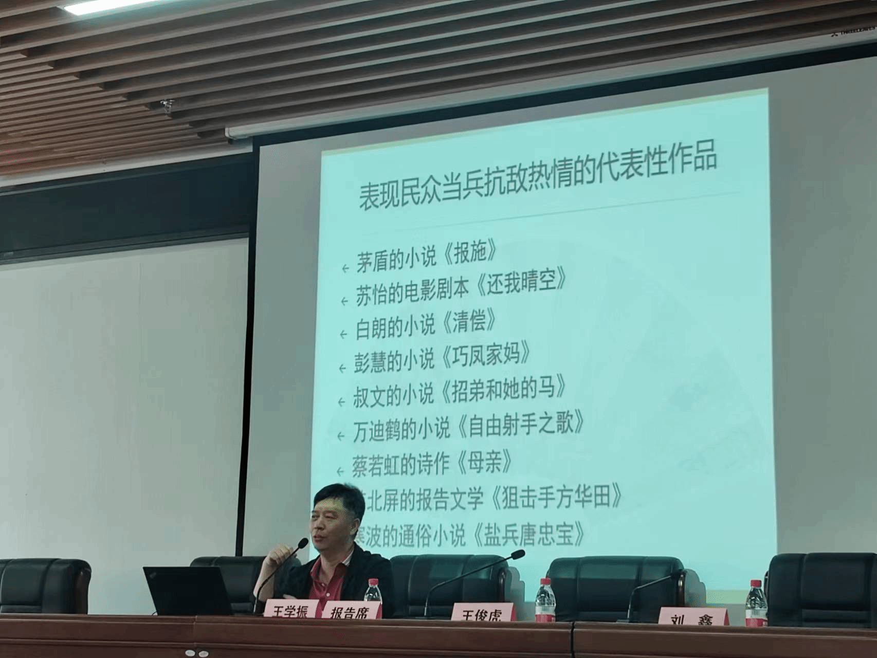 在报告会上,王学振教授基于学界对抗战文学的否定性评价及关键原因引入学术问题,从题材视角切入,在抗战文献的历史梳理中,按照内迁题材、兵役题材、空袭题材、空军题材、“慰安妇”题材等几大模块展开抗战文学形态揭示。王学振教授报告的抗战文学研究通过挖掘丰富生动的文学史料,展示大作家、普通作家、外国作家的诗歌、散文、小说等多种文体的多题材书写,进行抗战文学真貌的历史还原,并以此展开系统清晰的题材理论分析,强调了抗战文学在文学史上的重要价值,为在场师生带来一场颇具思想魅力的文学盛宴。