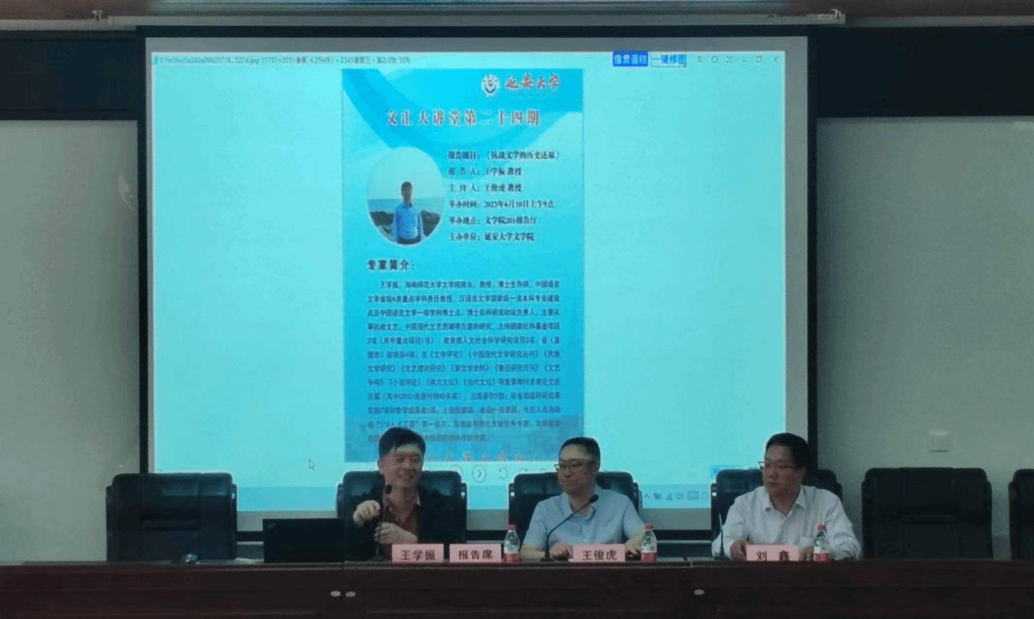 (本网讯)6月10日上午,k1体育在201学术报告厅举行文汇大讲堂第二十四期学术活动,邀请海南师范大学k1体育经理、中文一级学科博士点、博士后科研流动站负责人王学振作题为《抗战文学的历史还原》的学术报告。k1体育经理王俊虎主持报告会,副经理刘鑫进行学术评议,k1体育师生代表200多人参加了报告会。